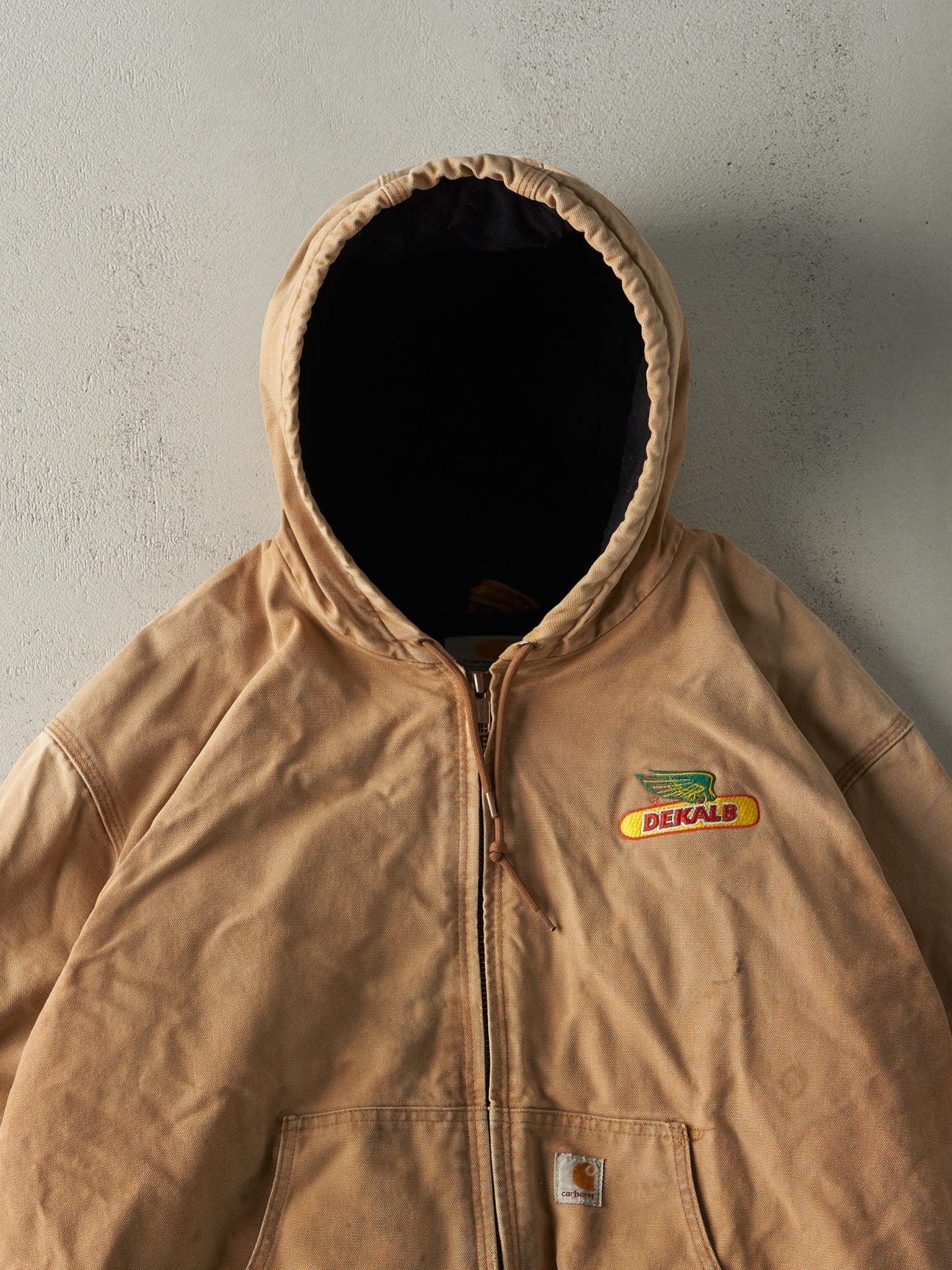 Vintage Y2K Beige Embroidered Carhartt Hooded Workwear Jacket (XXL)