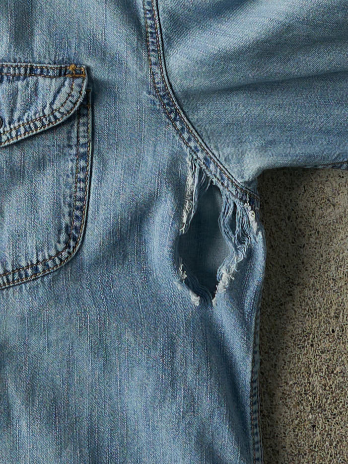 Condition: Rugged with discolouration, staining, distressing, rips and holes. Large rips in the armpits
